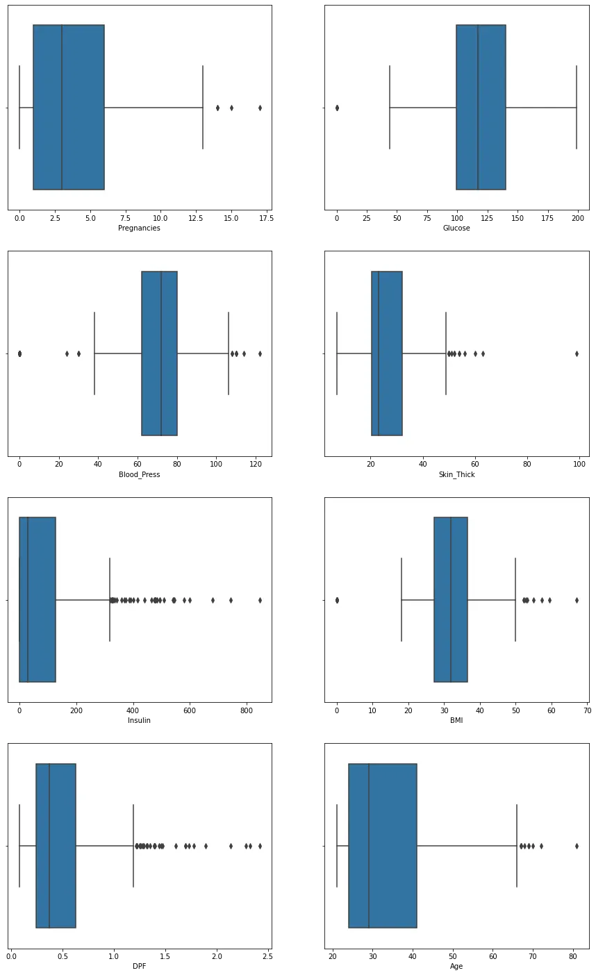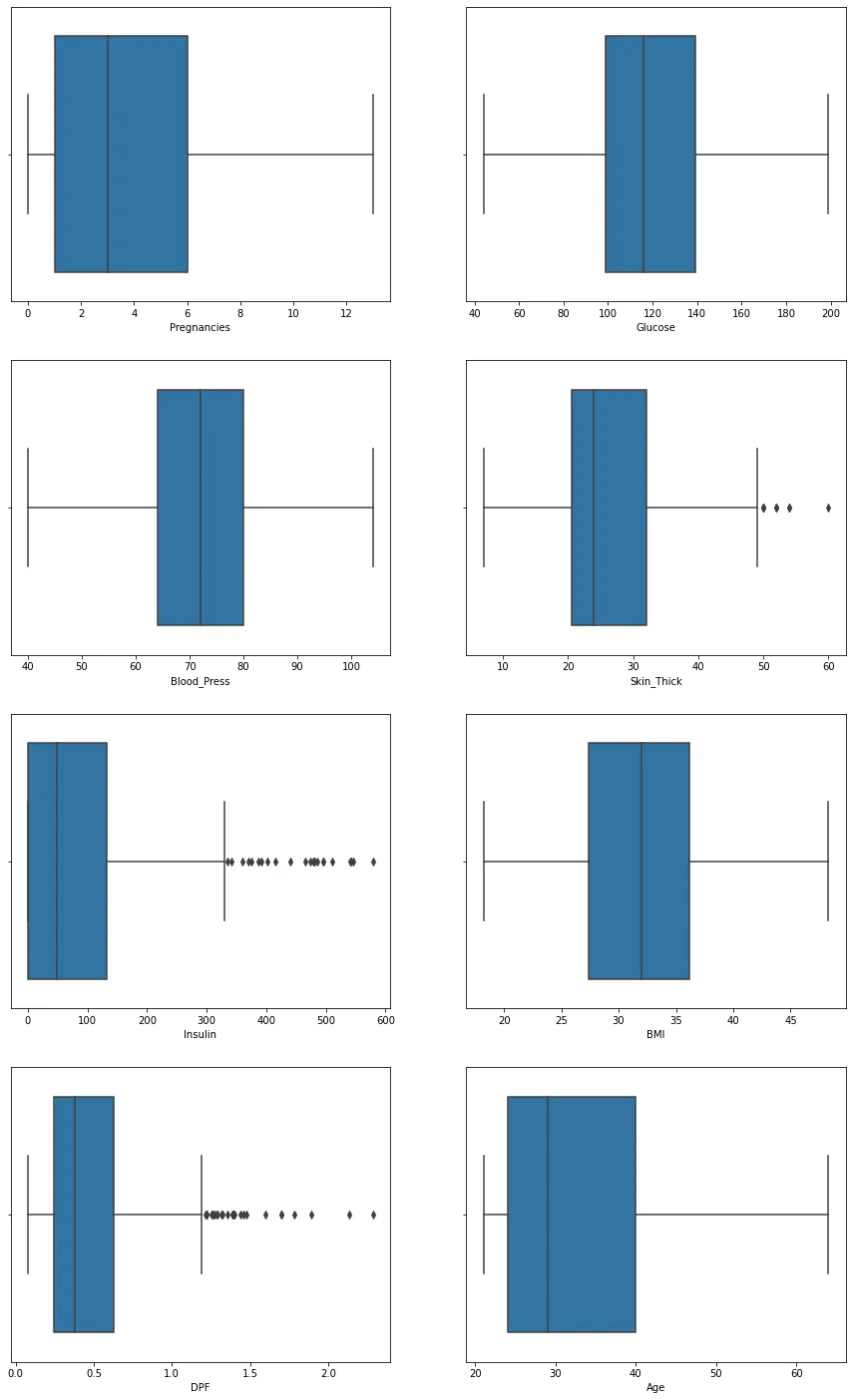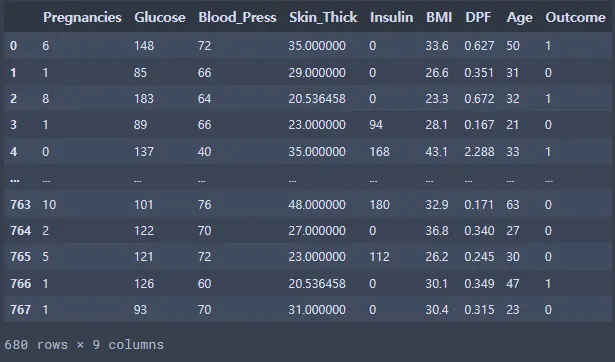 di_data3 = di_data2[(di_data2["Insulin"]<600) & (di_data2["Pregnancies"]<14) & (di_data2["Glucose"]>0) & (di_data2["Blood_Press"]<106) & (di_data2["Blood_Press"]>38) & (di_data2["Skin_Thick"]<90) & (di_data2["BMI"]<49) & (di_data2["BMI"]>0) & (di_data2["Age"]<65)]