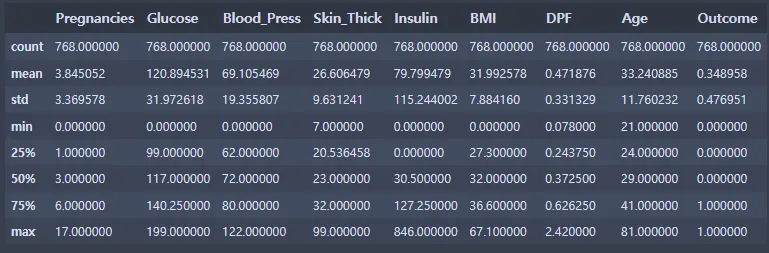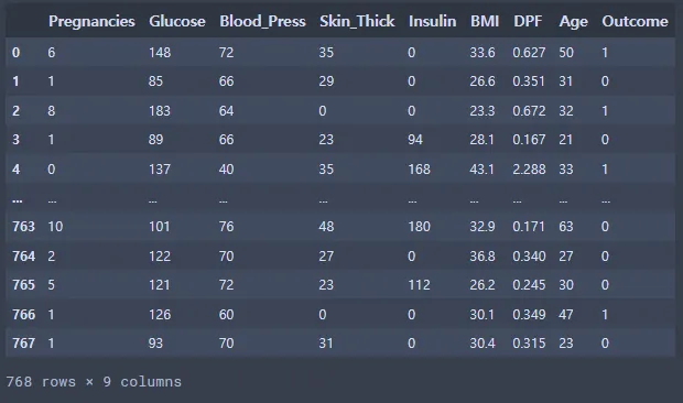 di_data2 = di_data.rename({'BloodPressure':'Blood_Press', 'SkinThickness':'Skin_Thick', 'DiabetesPedigreeFunction':'DPF'}, axis = 'columns') #열의 이름 수정