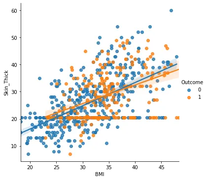 sns.lmplot(x = 'BMI', y = 'Skin_Thick', hue='Outcome', data=di_data3)
