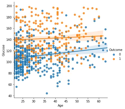 sns.lmplot(x = 'Age', y = 'Glucose', hue='Outcome', data=di_data3)