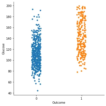 sns.catplot(x = "Outcome", y = "Glucose", data=di_data3)