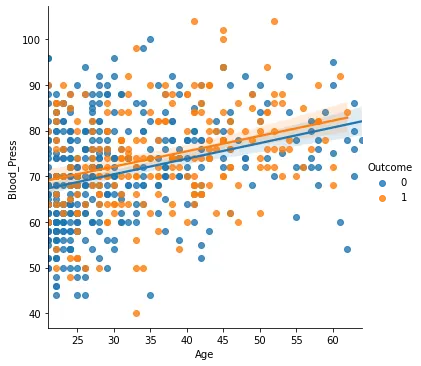 sns.lmplot(x = 'Age', y = 'Blood_Press', hue='Outcome', data=di_data3)