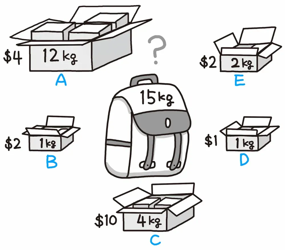 배낭에 담을 수 있는 무게의 최댓값(15kg)이 정해져 있고, 각각 짐의 가치($)와 무게(kg)가 있는 짐들을 배낭에 넣을 때, 가치의 합이 최대가 되도록, 즉 $의 가치가 최대가 되도록 짐을 고르는 방법을 찾는 문제이다.