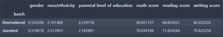 lunch 변수의 그룹 분석으로 알 수 있었던 것은 표준 양으로 밥을 먹었던 학생의 평균 점수가 높다는 것이었다.