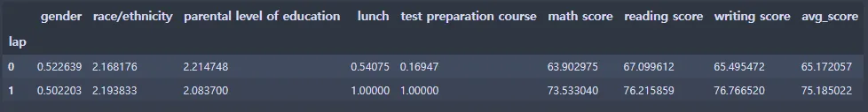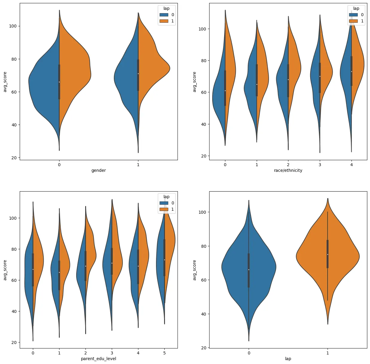 그러므로 시험 점수가 높은 학생들은 표준 양의 밥을 먹고, 시험 준비 코스도 하였을 것이라는 예상을 하였고, lunch 변수와 test_prepare(원 이름: test preparation course)변수의 값이 모두 1일때만 1의 값을 가지는 lap 변수를 만들어 내었다.