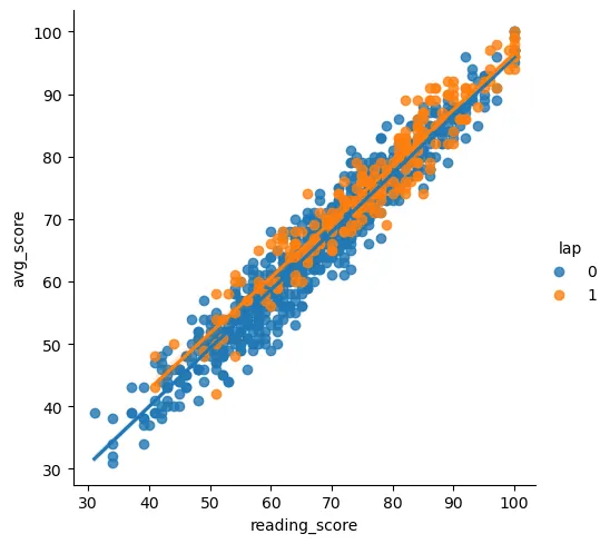 sns.lmplot('reading_score', 'avg_score', hue='lap', data=st_data3)