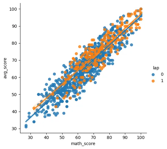 sns.lmplot('math_score', 'avg_score', hue='lap', data=st_data3)