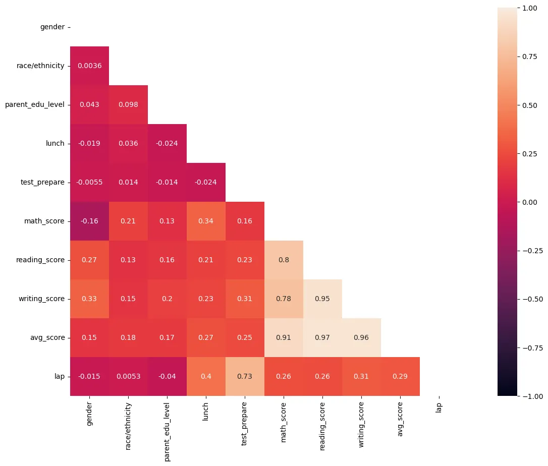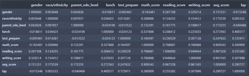 corrMatt = st_data3[['gender', 'race/ethnicity', 'parent_edu_level', 'lunch', 'test_prepare', 'math_score', 'reading_score', 'writing_score', 'avg_score', 'lap']]