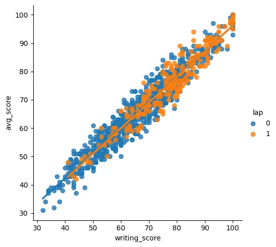 sns.lmplot('writing_score', 'avg_score', hue='lap', data=st_data3)