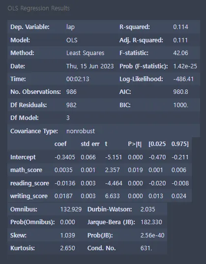 P > |t|(유의확률) P > |t|의 값은 전부 0.05보다 작은 값이 나왔고, 이는 math_score, reading_score, writing_score 변수가 lap 변수에 유의미하게 영향을 미친다는 의미이다.