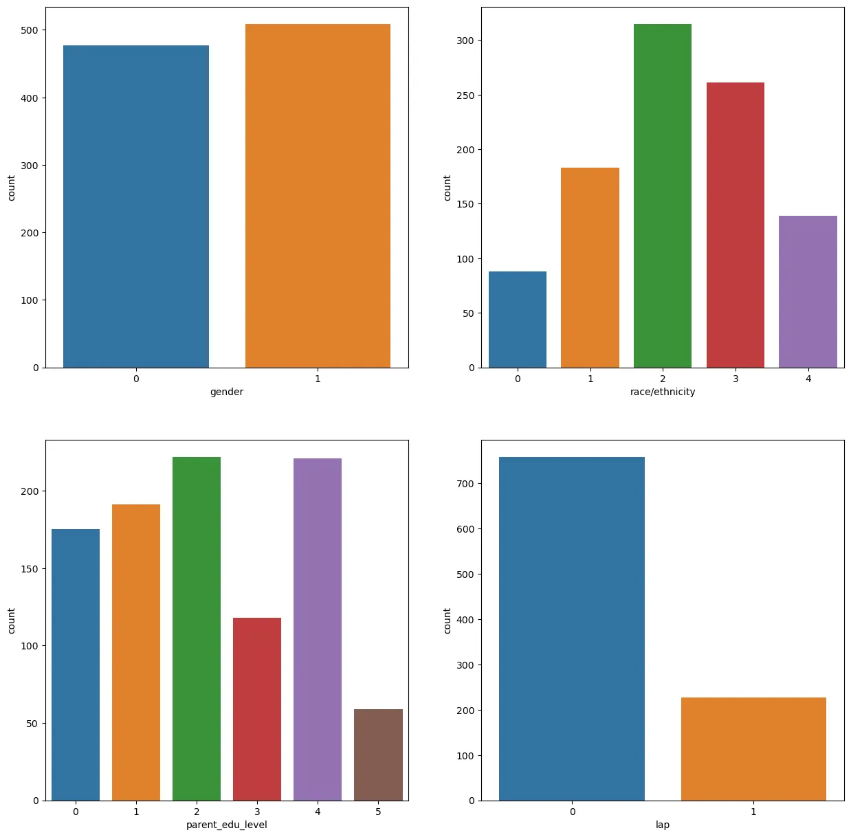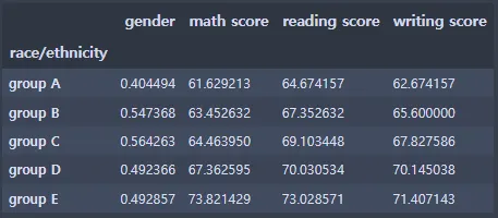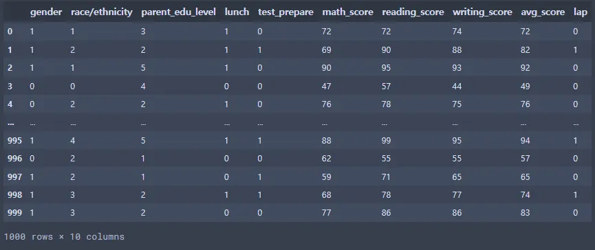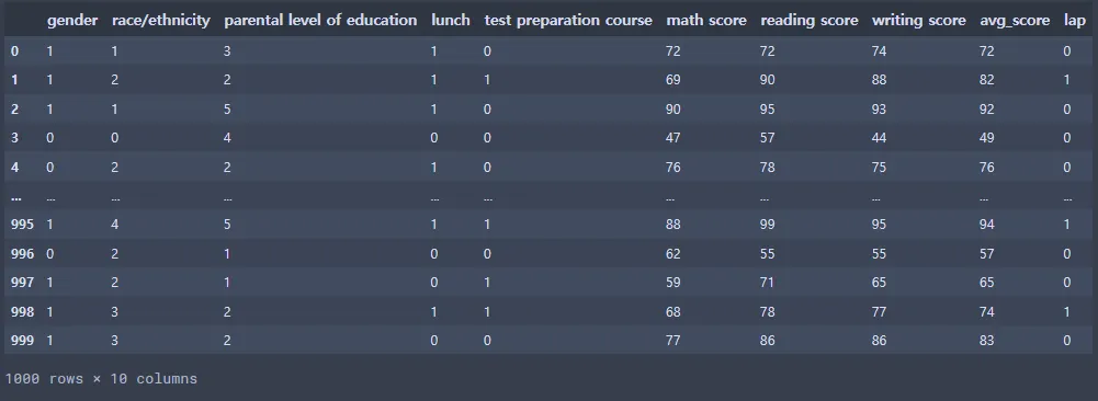 race/ethnicity 변수의 group A, group B, group C, group D, group E → 0, 1, 2, 3, 4