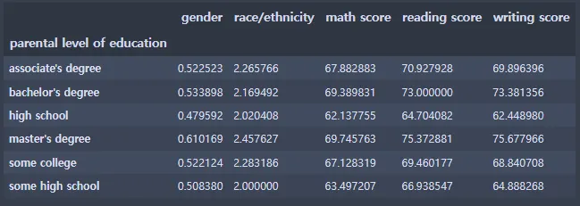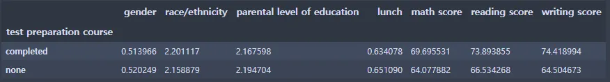 동시에, test preparation course 변수를 그룹 분석 한 결과, 시험 준비 코스를 했던 학생의 평균 점수가 더 높게 나왔다.