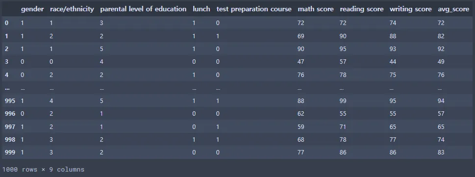 st_data['avg_score'] = (st_data['math score'] + st_data['reading score'] + st_data['writing score'])/3 #각각의 시험 점수의 평균값을 avg_score열에 넣는다.