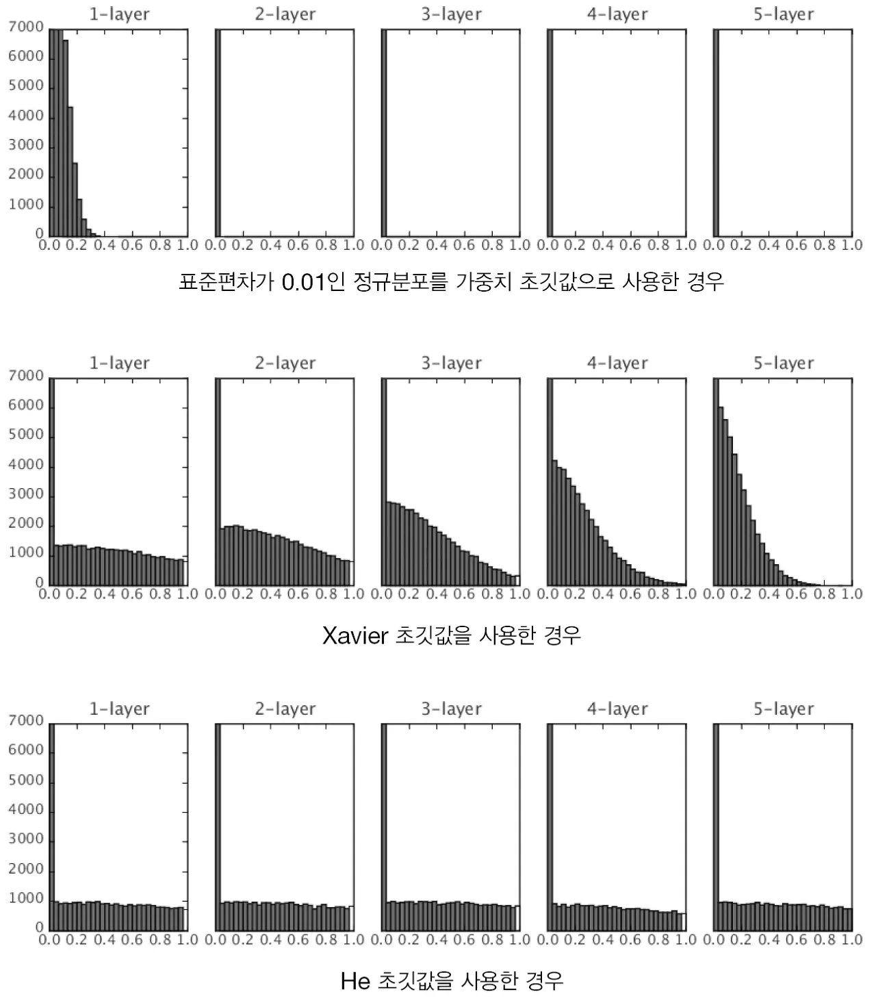 → 결론적으로 현재까지는 Sigmoid나 tanh 등의 S자 모양 곡선 활성화 함수를 사용할 경우 Xavier 초깃값을 사용하고, ReLU를 사용할 때는 He 초깃값을 사용하는 것이 가장 좋은 가중치 초깃값이라고 볼 수 있다.