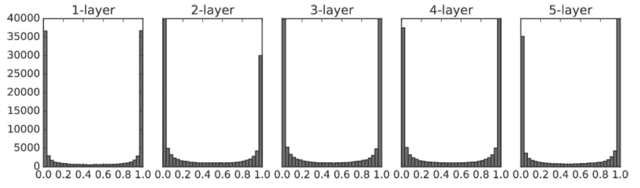 표준편차 1인 정규분포로 가중치를 초기화 했을 때의 각 층의 활성화값 분포
