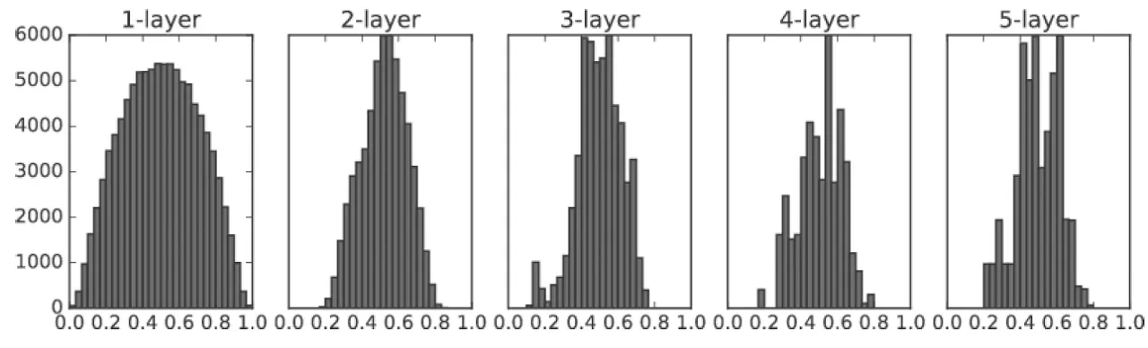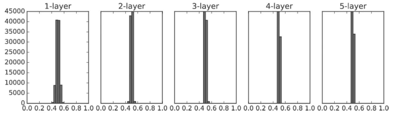 표준편차 0.01인 정규분포로 가중치를 초기화 했을 때의 각 층의 활성화값 분포